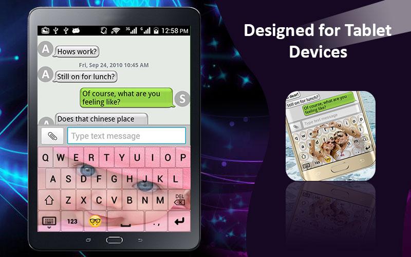 You can personalize your keyboard by Selecting your photo as keyboard background, Personalize your chatting with Stylish and beautiful photos!, You can take photo with phone camera or select any image from Gallery, Select you Girl or Boy Picture to make Love-keyboard, View your favorite theme when typing with great input tool,cute photo keyboard
