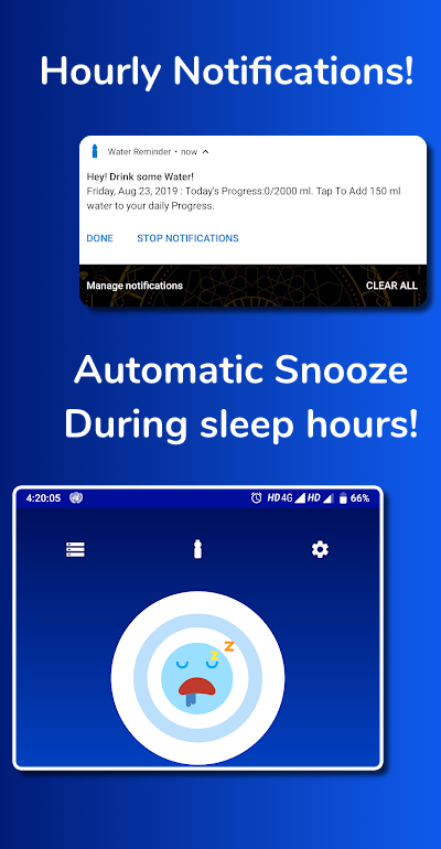 - After that it will remind you at regular intervals to drink water.It will automatically snooze these reminders when you are sleeping during the night( based on the sleep times you provide)