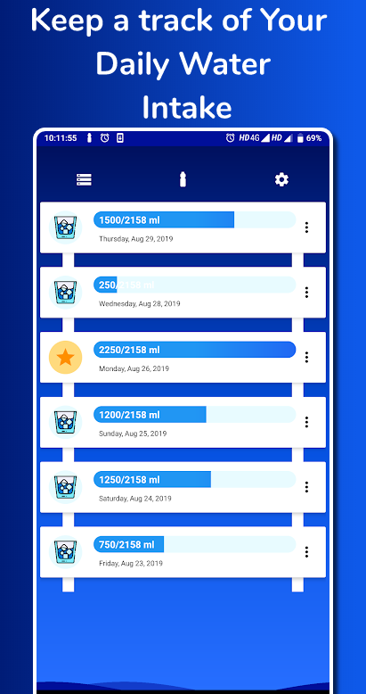 - It also automatically records your total daily intake( accessible via the leftmost menu). You can check at which day you drank less water than required.