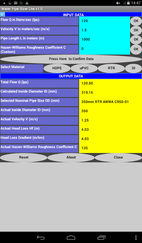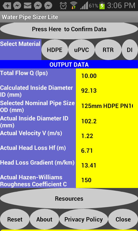 Algorithms used in Water Pipe Size Calculator Lt are based on principles of hydraulics for pressure pipes. Pipe sizing calculation is based on the discharge/continuity formula Q=AV, where Q = flow rate in liters per second, A = cross sectional area of pipe in millimeters, and V=velocity of water in the pipe . Head loss calculation is based on Hazen-Williams friction loss equation Hf=10.7*L*(Q/C)^1.85/D^4.87 where Hf =friction loss in meters, L=pipe length in meters, C=Hazen-Williams friction loss coefficient, and D=diameter of pipe in millimeters. Pipe sizes are based on standard specifications for the following materials: Ductile Iron (DI), IS0 2531, BSEN 545 & 598; Reinforced Thermosetting Resin / Fiberglass (RTR, GRP, GRE, FRP), AWWA C950-01; High Density Polyethylene (HDPE), SDR11, PN16, PE100; uPVC, PN16, Class 5, EN12162, ASTM1784. Inside pipe diameter or nominal bore for other standards may differ and not included in the built-in catalogues in this application. However, the user can still use the app to determine the required internal diameter for other pipes of different pressure classes and refer to corresponding pipe catalogues for standard nominal pipe diameter selection.