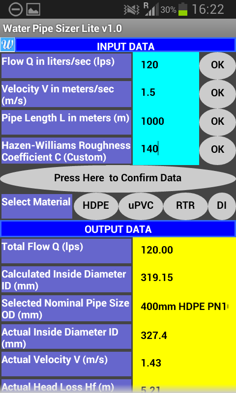 Water Pipe Size Calculator Lt, a clean water pipe sizing application program for android devices is a handy tool for Civil Engineers, Designers, and other engineering professionals who are involved in clean water networks design. The app features quick pipe sizing and quick calculations for flow velocity and pipe head loss due to friction. It is intended for single pipe analysis or one pipe at a time for series of pipes and thus, may serve as a tool for design reviewers when verifying pipe sizes in hydraulic models. Pipe size selection is based on built in catalogs for various pipe materials compliant to certain standards.
