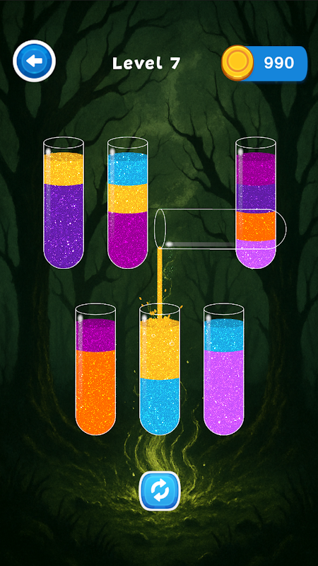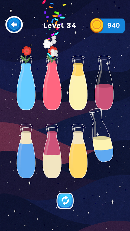 Sort all the colored water into individual tubes so that each tube contains only one color and is completely filled. When a level begins, you'll see several transparent tubes filled with layered water of different colors. Some tubes may be empty. Keep pouring the colored water carefully, layer by layer, to group matching colors into the same tube.