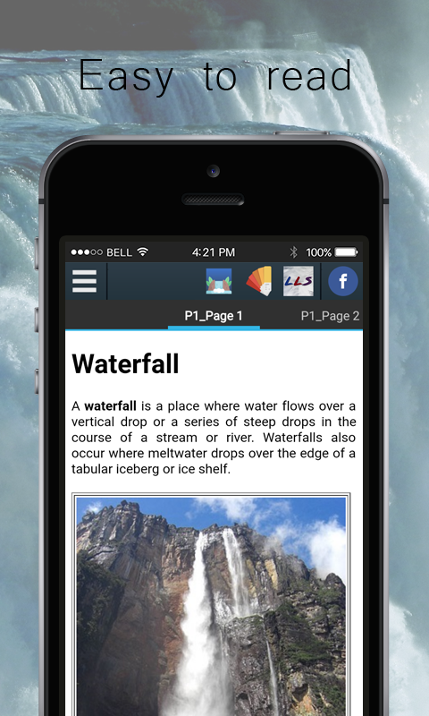 A waterfall is a place where water flows over a vertical drop or a series of steep drops in the course of a stream or river. Waterfalls also occur where meltwater drops over the edge of a tabular iceberg or ice shelf.