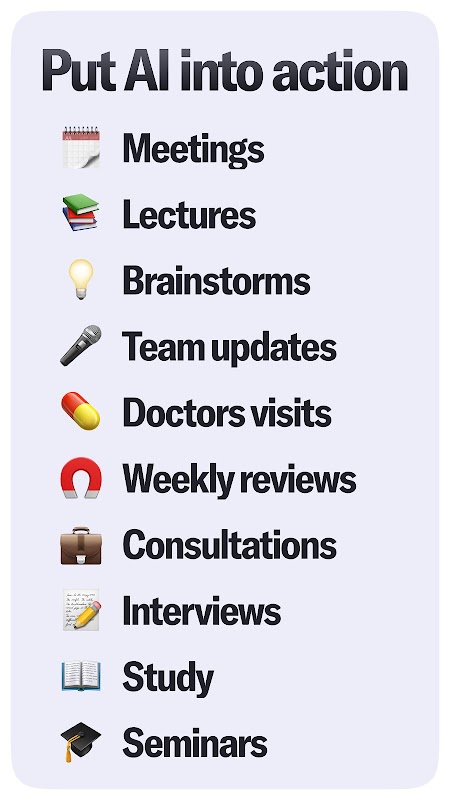 Whether you are capturing meeting notes, recording a lecture, or brainstorming ideas, the recorder captures everything while the app transcribes audio behind the scenes so you can focus on listening.