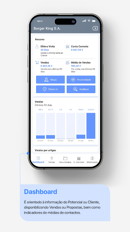 It also allows you to access detailed information on customer files, Articles, Current Account statements, Sales History and financial analyzes related to the Salesperson's activity, whilst remaining permanently synchronized with your company's management software.