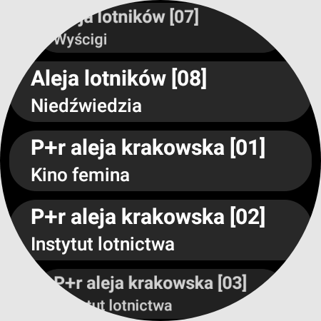 Aplikacja dla Wear OS daje dostęp do listy 15 najbliższych przystanków, ulubionych (niezależnych od aplikacji dla telefonu) oraz przeszukiwania listy wszystkich przystanków.