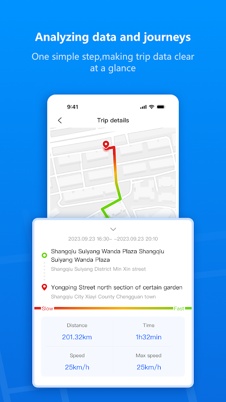 Revisit and explore detailed route histories, allowing you to effortlessly retrace your journeys and relive memorable drives. In the recorded journey, different speeds will be displayed in different colors and you can easily see the speed change during the journey