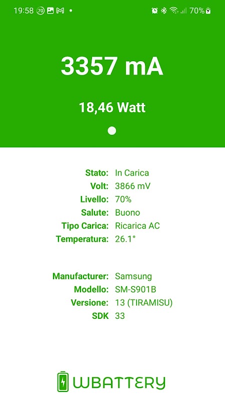 With this application you will be able to measure the charging current in mA and above all the WATTS that the charger that recharges the battery delivers. Furthermore, some useful information on the battery status and system information is shown.