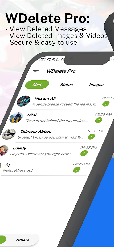 • Messages Recovery: Recover Whatsapp deleted Messages to restore deleted photos automatically.