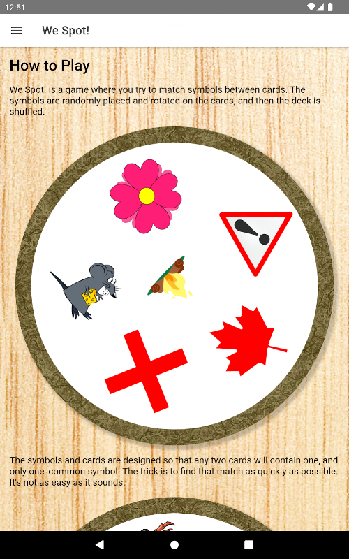 We Spot! is a game where you try to match identical symbols between cards.
