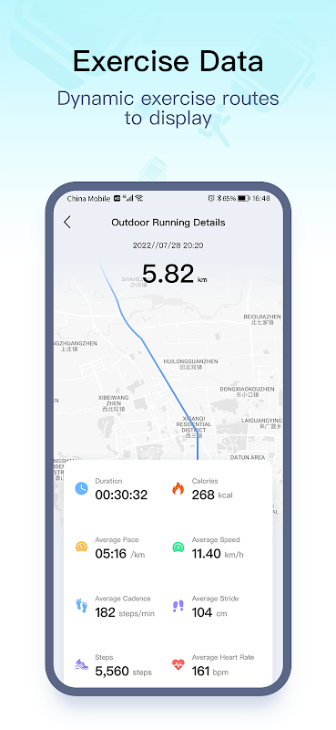 3. Record GPS sports, support running, cycling, walking and climbing sports, support background operation, can record exercise time, exercise distance, pace, cadence, step count and other data.