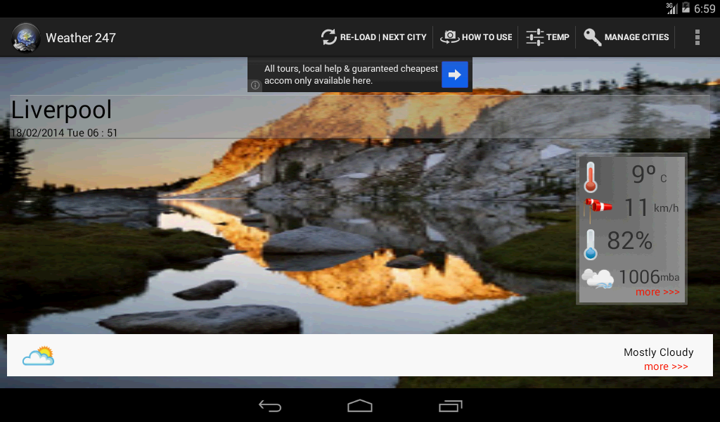 Weather 247 is a simple weather app which will give you constant weather updates at your location. The app is re-designed and it no longer use GPS. With the new version you will be able to customize your locations and monitor multiple places. You will be able to get current weather conditions and forecasts(36 Hours and up to 10 days).Also includes Map Layers and traffic services from Google.