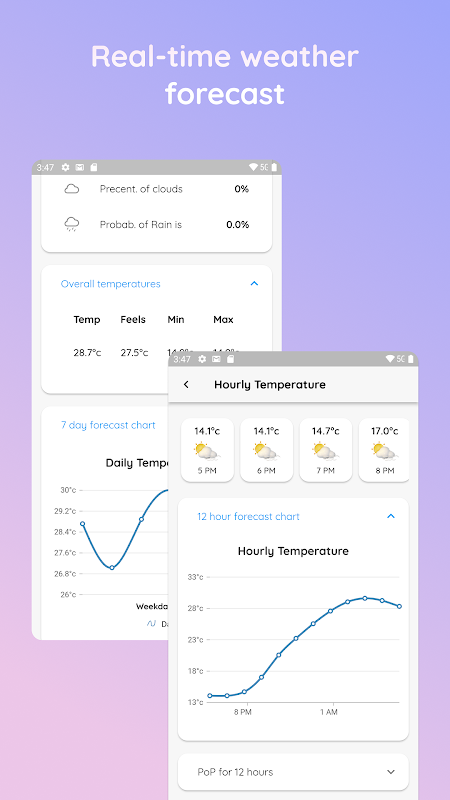 3.Hourly weather chart for 12-hours and next 7-days forecast.