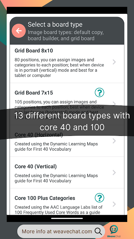 - Create and/or modify AAC boards via 3 options: grid position boards (ranging from 1x2 - 7x15), hide images, and/or create a new board from scratch