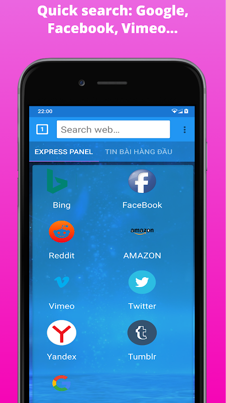 • Quick search: Google, Facebook, Vimeo and other default search engines