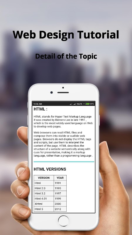 Web Development is a Free app which teach you how to design and develop a web site using HTML, CSS, JAVASCRIPT , Responsive Web design and Content Management Systems like (Wordpress, Joomla and Drupal) and other advanced topics directly on your Android devices.
