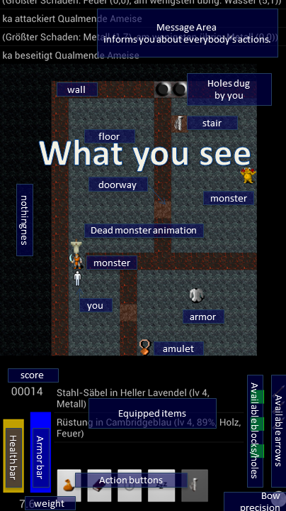 - Monsters may pick up stuff, wield weapons, wear armor. Some will follow you, some will act in teams, some will run away or mind their own business.