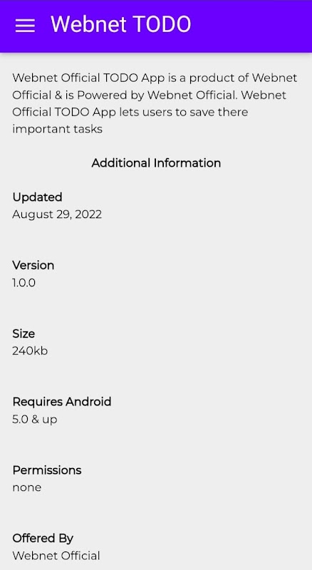 Webnet Official TODO App is a product of Webnet Official & is Powered by Webnet Official. Webnet Official TODO App lets users to save there important tasks