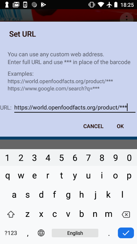 It has it's own build-in fast barcode scanner at the top of the screen and shows the results just bellow it. The scanned bar code will be placed where you put *** in the URL string.