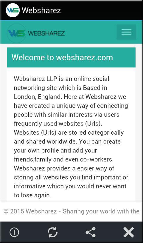 Websharez LLP is an online social networking site which is Based in London, England. Here at Websharez we have created a unique way of connecting people with similar interests via users frequently used websites (Urls), Websites (Urls) are stored categorically and shared worldwide. You can create your own profile and add your friends,family and even co-workers. Websharez provides a easier way of storing all websites you find important or informative which you would never want to lose again.