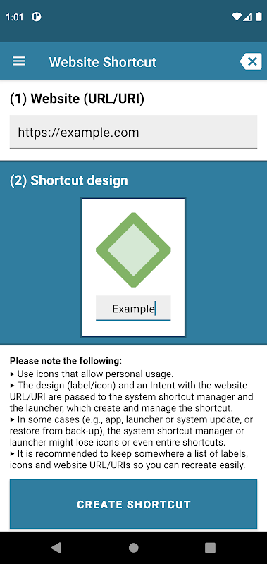 Personalize your Android homescreen by creating your own icon shortcuts for websites (URL/URIs). Customize your website shortcuts with your own selected text and image. Furthermore, there are no advertisements and it's free. I made it originally for myself, and decided to share. Giving a fair rating is very well appreciated!