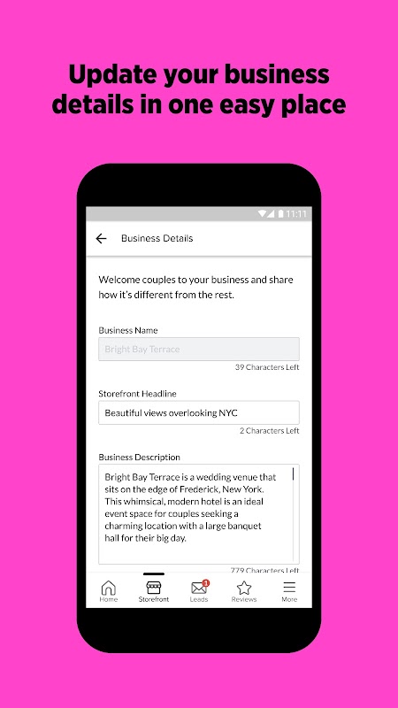 5. Storefront Management. Show couples who you really are by customizing your business description and details, and adding photos that inspire.
