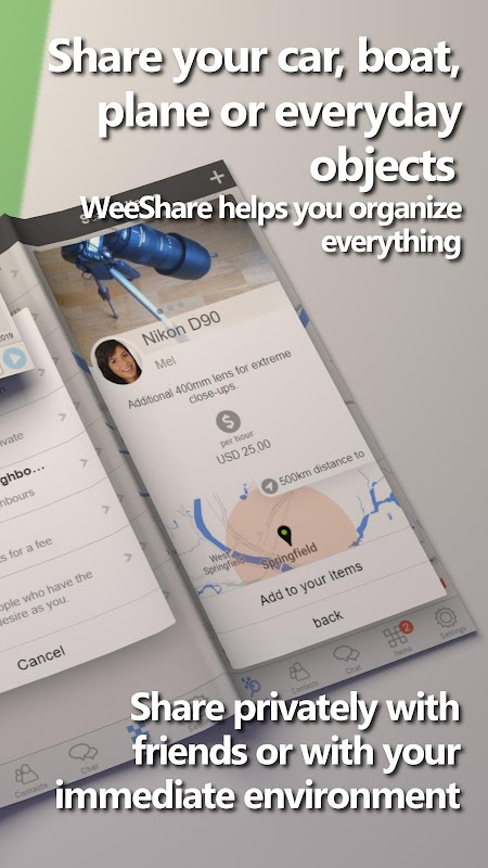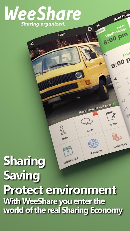 Do you own a vehicle or a vacation home which is also being used by other people? Do you share your outdoor equipment or a studio with friends? Coordinate reservation requests and keep track of expenses and costs. Communicate with other users and let them know where the object is located. Invite more friends to share with WeeShare.