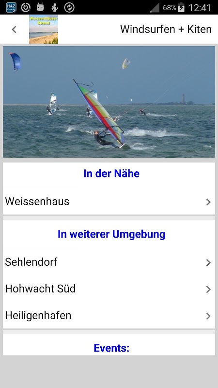 The Weissenhäuser Strand app for your vacation in the Weissenhäuser Strand area is particularly intended for all water sports enthusiasts (especially sailors, kiters and windsurfers) but also very helpful for "non-water sports enthusiasts" among vacationers and residents and "sun worshipers". It offers extensive information about weather, wind, beaches, surfing and kite spots, traffic, restaurants, accommodation, excursions, etc. This app is still being developed and we welcome suggestions.