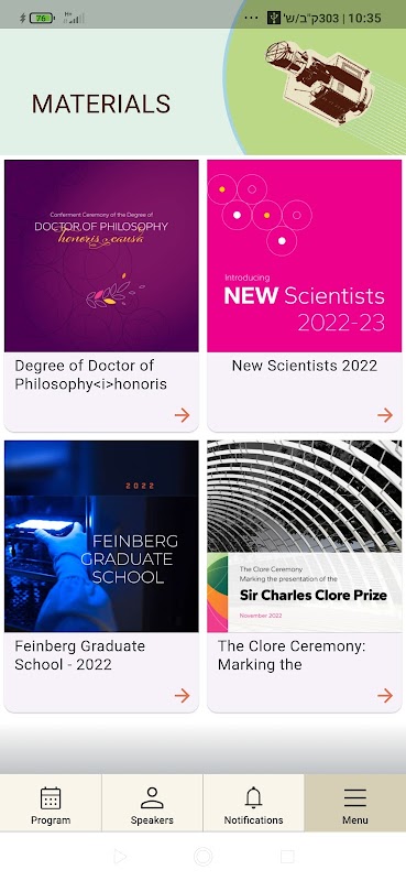 The Weizmann International Board app contains all of the information necessary to take full advantage of the offerings available at the Annual General Meeting of the International Board. You have the convenience of viewing the program, obtaining information about the speakers, familiarizing yourself with this year’s PhD honoris causa recipients, and more.