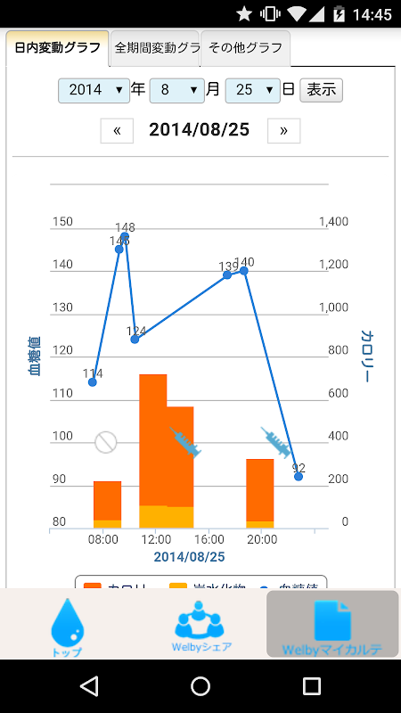 いつ血糖値を測ったのか、いつインスリンを投与したのか一目で把握でき、かんたんに振り返ることができます。