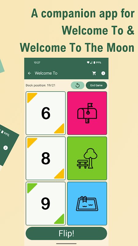 A companion app for Welcome To and Welcome To The Moon series of boardgames, flip cards easily, save your game, save precious table space or play on the move! No shuffling or deck set up required!