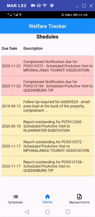 The Welfare Tracker Inspector Tool is designed to work in conjunction with the Welfare Tracker Web Application (https://www.welfaretracker.co.za) as a simple scheduling and complaint management tool for existing Animal Welfare Societies.