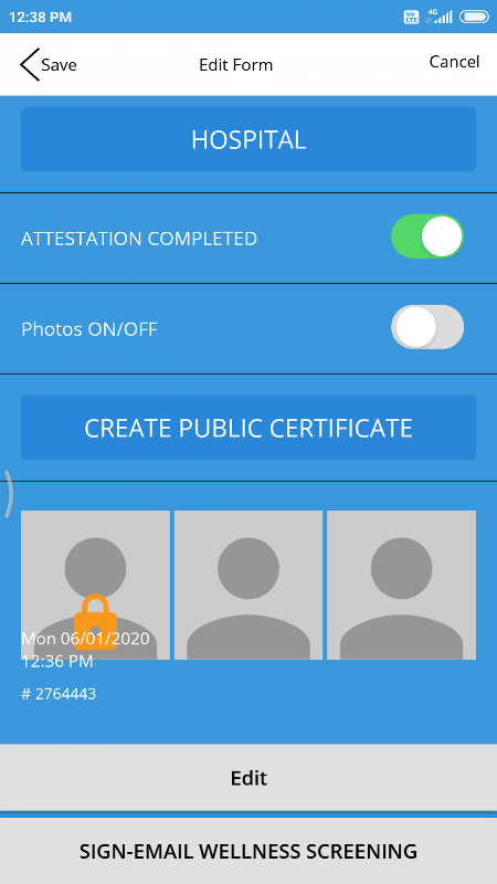 This powerful, user-friendly app with embedded medical screening requirements, is designed for hospitals, medical facilities, health care professionals as well as restaurants, commercial kitchens, food preparation facilities, schools, universities, childcare facilities, cities, states, provinces and private employers. The certification process for determining employee health during a contagious event has become increasingly tedious and demanding due to increased public expectations and the complexity of the medical contagion. The traditional method of head count and verbal survey is far too slow and costly for today’s modern needs. The Wellness Screening Application provides a consistent, streamlined documentation and signoff process for all user groups to use from self-inspection (self-quarantine) of symptoms to signoff. It leverages smartphone technology with our patent-pending, time-locked documentation process that includes embedded photos watermarked with time, date, employee temperature, and GPS location in addition to sorting, storing, and emailing documents and enabling signature capture (E-Sign). Medical screening symptoms may be selected and auto filled into the document. Images of employee’s health conditions can be captured, and time-date stamped into the certification document. Instantly print and post or e-mail these results at your facility to ensure your customers and employees a safer working environment. This process also may help mitigate liability and risk of spreading the contagion.
