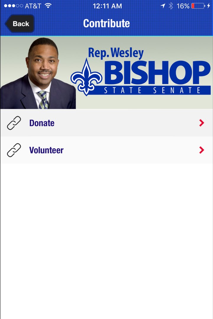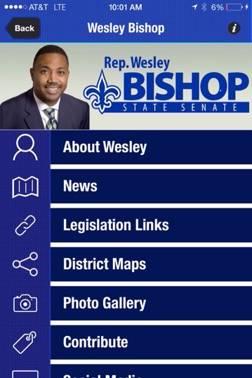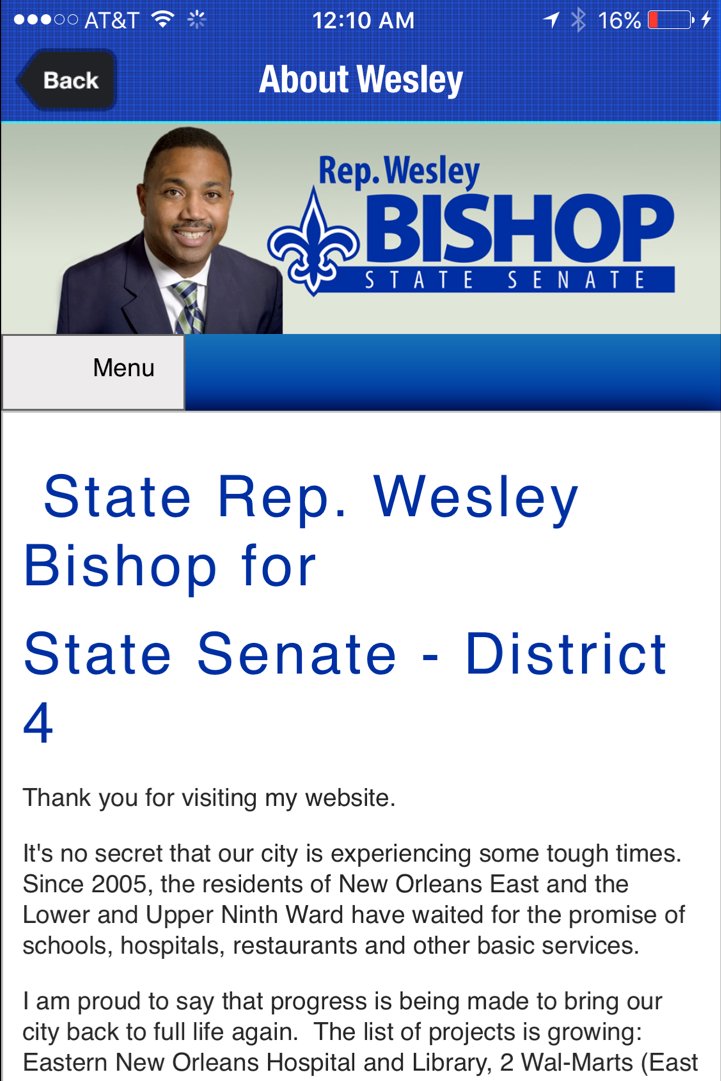 The purpose of the app is to stay abreast of Wesley Bishop's political work.