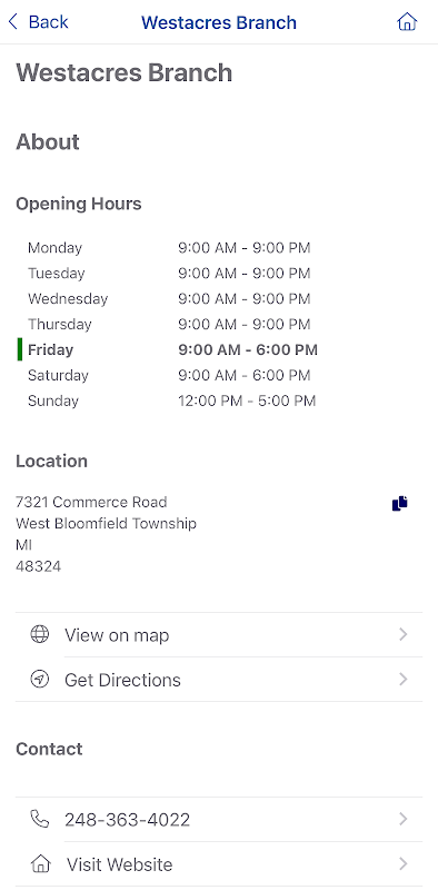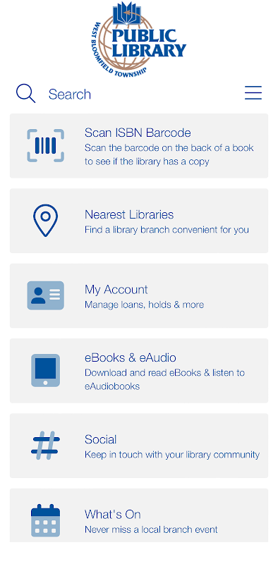 Access the West Bloomfield Township Public Library from your Android phone or tablet. Manage your library account, search the catalog, place holds, and see when your holds are ready for pickup.