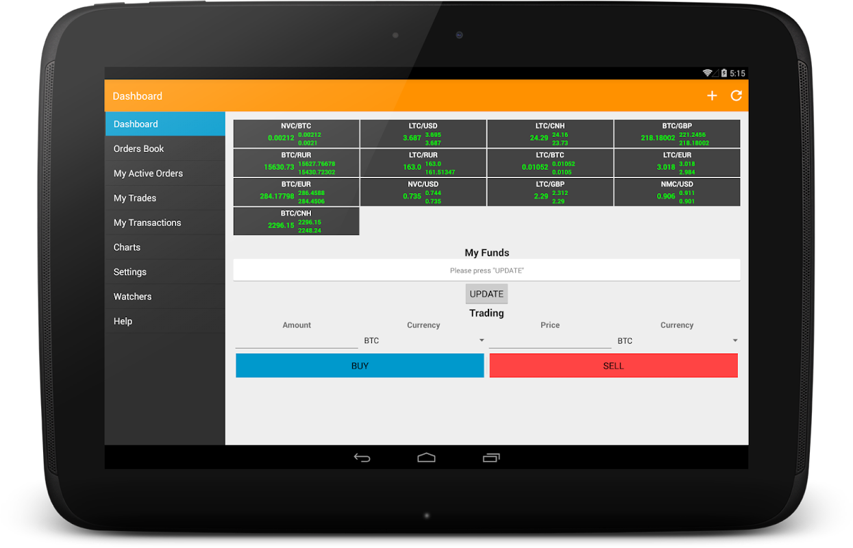 – Supported exchange pairs: BTC/USD, BTC/RUR, BTC/EUR, LTC/BTC, LTC/USD, LTC/RUR, LTC/EUR, NMC/BTC, NMC/USD, NVC/BTC, NVC/USD, USD/RUR, EUR/USD, TRC/BTC, PPC/USD