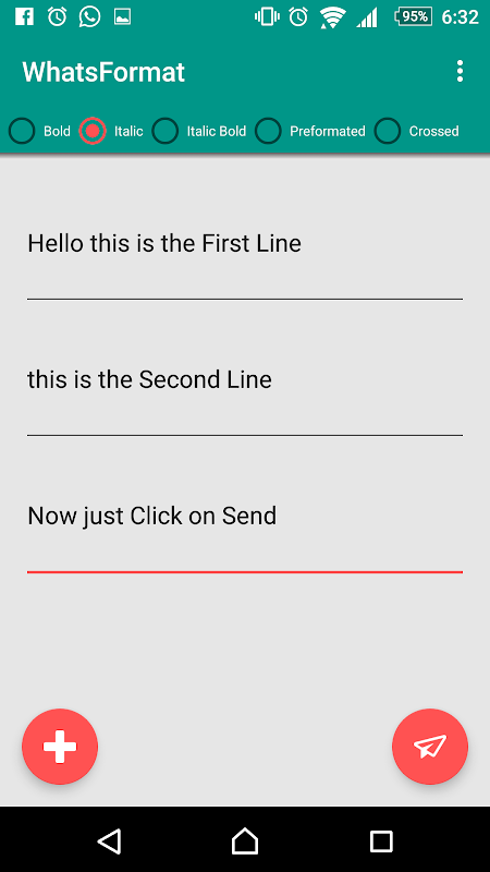 Whats4Mat Allows you to s=choose between 5 Text Formats and share the formatted text via WhatsApp