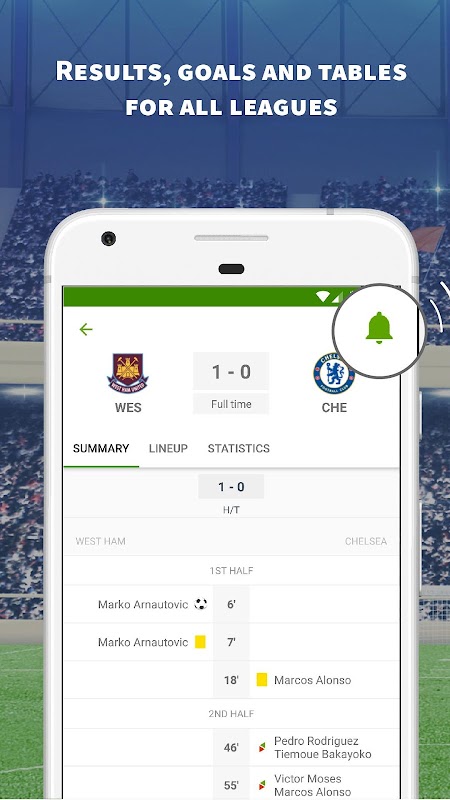Choose from a wide range of soccer competitions from around the world or simply mark one or more soccer teams as your favourites. This lets you customise the information you see in the app and receive through notifications and alerts, including goals, news, matches, league tables and line-ups.