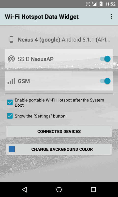 The widget intended to enable/disable Wi-Fi Hotspot and the monitoring the device adapters (Wi-Fi adapter, data transfer over cellular).