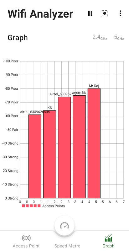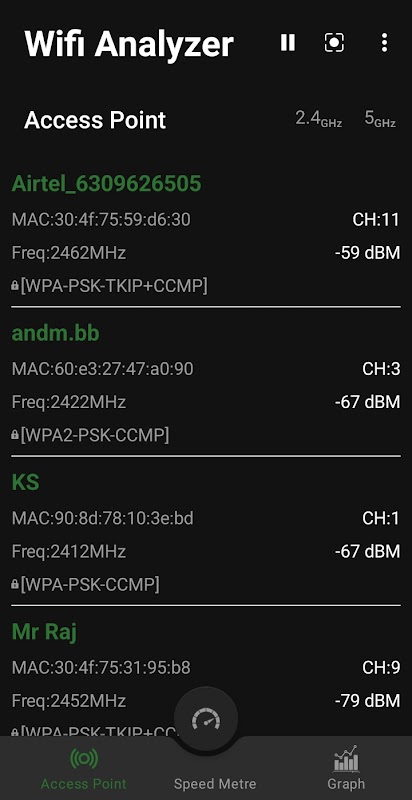 WiFi Analyzer is a free, fast, and secure app that helps you analyze both 2.4 GHz and 5 GHz Wi-Fi networks. Network analyzer helps you find the best channels and locations for your router, improving your network's performance. It works as wifi scanner and finds list of nearby Wi-Fi networks with details such as signal strength, MAC address, frequency, channel and security type, Wi-Fi security protocol WPA2-PSK CCMP and make informed decisions to optimize efficiency.