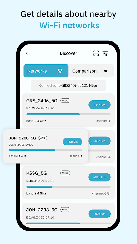 With the help of this app, you can do real time analysis of nearby Wi-Fi networks. In this, you get the details of available WiFi networks like frequency band, channel signal strength, and security. You can apply many types of filters in it. You can also see a comparison graph of available WiFi networks.