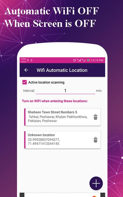 Most of the time WiFi consumes much of battery and data if you forget to switch it off after using, this tool helps you to switch off WiFi after a period of disconnection at least 1 minutes or 30 seconds. Also Automatic WiFi app can set to regularly scan for available networks to connect to and re disable WiFi if no suitable network is found. WiFi Automatic ON OFF app automatically turn ON OFF WiFi again you enter a specified location , so when you enter to that specify location WiFi automatically off or on .