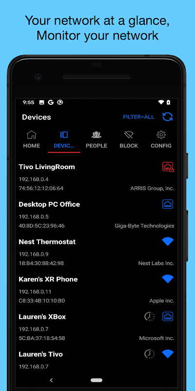 • See all devices using your WiFi with filter options to see who's devices are still switched on past bedtimes, or identify unknown/neighbour WiFi thief's connecting to your WiFi