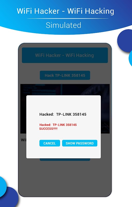 Wifi Password Hacker Prank simulates the process of hacking any wireless network with your phone. Just one key to break the wifi and hack all the passwords. So it is a funny app used to prank your friends and have fun. Your friend will be surprised to see this amazing thing happen. You will look awesome and professional.