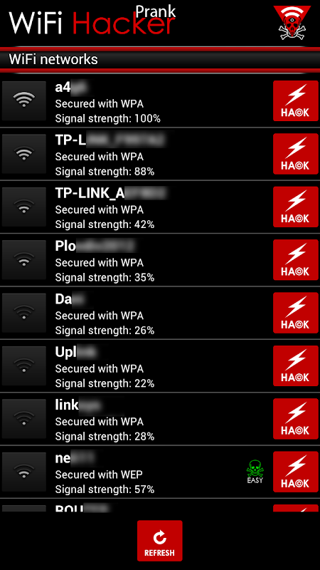 WiFi Hacker Prank scans for available wifi networks and displays security information about them. WiFi Hacker highligts routers with potentially weak protection. The hacking begins when you tap on a wifi network in range. A scary looking black box appears and pretends to break the networks protection.