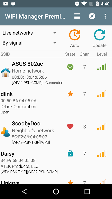 Find, connect, manage WiFi networks. Improve connection quality with a channel radar. Discover open networks around you. Set the app to scan for and switch to best network.