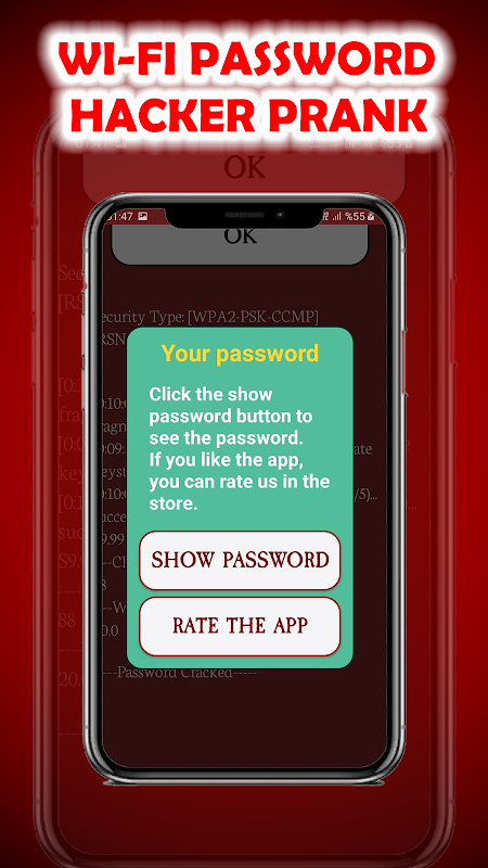 WIFI Password Hacker Prank is a prank app. It is WIFI hacking simulator and it only pretends to break into secured WIFI network. All passwords are randomly generated and are not a real passwords stolen from the router.
