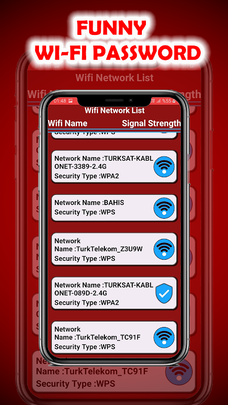 Wifi Password Hacker Prank simulates the process of hacking any wireless network with your phone. Just one key to break the wifi and hack all the passwords. So it is a funny app used to prank your friends and have fun.