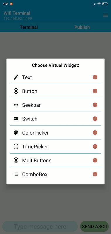 - Custom your own widgets(button, switch, text, seek bar, color picker, time picker, combo box and multibutton) for frequent sending of same data.