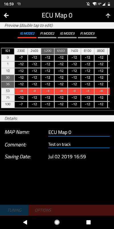 App appearance and functionalities varies depending on the connected device and ECU. Images shown may refer to: WiFiCOM on GET ECUs; WiFiCOM on Honda CRF stock ECUs; MX-TUNER 2.0 on Suzuki RM-Z stock ECUs.
